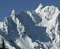 Nooksack Tower (8,285 feet (2,525 m)) is in North Cascades National Park in the U.S. state of Washington.[3] Nooksack Tower is part of the Mount Shuksan Massif and is .75 mi (1.21 km) northeast of the main summit of Shuksan. Nooksack Tower looms to the west over Nooksack Cirque. The East Nooksack Glacier lies to the southeast, West Nooksack Glacier to the east and Price Glacier is on the north flanks of the tower. Nooksack Tower is one of the most difficult mountains to climb in the Cascade Range, with loose rock, 50-degree or greater slopes and ice ridges as well as accessibility issues and exposure, all weighing into the climbing equation. The descent may require ten or more rappels.[4]