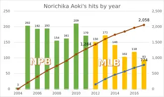 While Aoki missed Suzuki's NPB record for hits in a single season of 210, he finished with a league-record 202 hits (his 169 singles were an NPB single-season record).[4] He led all Central League players in batting average (.344) and hits, and was voted the league Most Valuable Rookie.