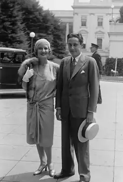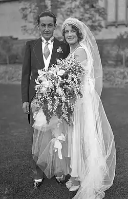 By 1927, Shearer had made a total of 13 silent films for MGM. Each had been produced for under $200,000, and had, without fail, been a substantial box-office hit, often making a $200,000+ profit for the studio.[31] She was rewarded for this consistent success by being cast in Ernst Lubitsch's The Student Prince in Old Heidelberg, her first prestige production, with a budget over $1,000,000. While she was finishing The Student Prince, Shearer received a call summoning her to Thalberg's office. She entered to find Thalberg sitting at his desk before a tray of diamond engagement rings. He granted her the option to choose her own ring; she picked out the biggest. After weeks of rumors, provoked by wearing the ring, it was announced in August 1927 that they were to wed.[32] On September 29, 1927, they were married in the Hollywood wedding of the year. Shearer had two children with Thalberg – Irving Thalberg, Jr. (1930–1987), and Katherine (1935–2006). Before they were married, Shearer converted to Judaism so she could marry Thalberg.[33]