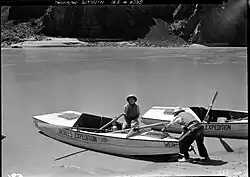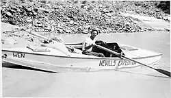 Although most of Nevills' river trips were on the San Juan, he ran seven trips through the Grand Canyon: 1938, 1940, 1941, 1942, 1947, 1948, and 1949. Nevills' chance for fame came in 1938, when he had the opportunity to escort Dr. Elzada Clover and Lois Jotter, two botanists from the University of Michigan who wished to catalog the flora of the Grand Canyon, from Green River, Utah, to Lake Mead. They encountered extraordinarily high water at the confluence of the San Juan and the Colorado, but finished the trip without serious incident.[5] Their 43-day, 666-mile trip generated a lot of publicity for Nevills.[3] At least one river historian, Otis "Dock" Marston, in reviewing all the journals after the trip, noted that the success of the cruise was due in large part to Dr. Clover's insistence new boatmen be found to replace the two that quit at Lee's Ferry.[6]