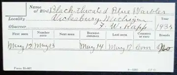 The North American Bird Phenology Program houses a unique and largely forgotten collection of six million Migration Observer Cards that illuminate migration patterns and population status of the birds of North America. These handwritten cards contain almost all of what was known of bird distribution and natural history from the latter part of the 19th century through World War II. The bulk of the records are the result of the work of a network of observers who recorded migration arrival dates in the spring and fall in a program that, in its heyday, involved 3000 participants. Today, those records are being processed and placed into a modern database for analysis. This information will be used, along with recently collected arrival times of migrant birds, and in conjunction with historical weather data, to examine how bird migration is being affected by climate change. The information from this analysis will provide critical information on bird distribution, migration timing and migration pathways and how they are changing. There is no other program that has this depth of information that can help us understand the effect that global climate change has on bird populations across the continent.[1]