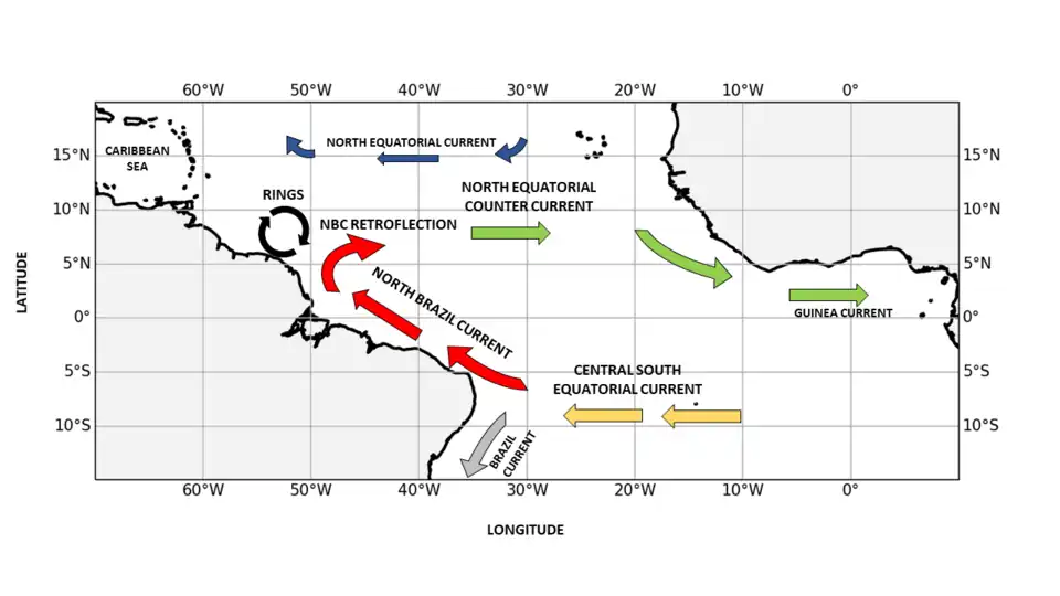 Retroflection of the NBC occurs off the coastal border between Brazil and Guyana between 4ºN to 7ºN and 48ºW to 50ºW.[3] The NBC begins just off the coast of north-eastern Brazil, approximately around 10ºS and 31ºW where the central South Equatorial Current (cSEC) bifurcates into two. The branch that separates southward along the South American continent is called Brazil Current (BC) and the branch that flows northward is called the NBC.[4] The North Brazil Undercurrent (NBUC), which flows in the sub-surface along with the NBC, retroflects as well. However, before the retroflection, there are multiple points of bifurcation along its trajectory.[5] From its origin, it branches off to feed into the South Equatorial Undercurrent (SEUC), the Equatorial Undercurrent (EUC), and finally retroflects to mix with the North Equatorial Undercurrent (NEUC).
