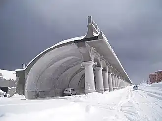 The North Breakwater Dome (北防波堤ドーム, kita bōhatei dōmu) is a long arched "semi-domical" structure in the port area of Wakkanai, Hokkaidō, Japan. Rising to a height of 13.6 metres (45 ft) above the sea and extending some 427 metres (1,401 ft), with seventy columns, an intercolumniation of 6 metres (20 ft), and a width from column to wall of 8 metres (26 ft), the form, inspired by a Roman arcade, is said to be without parallel.[1][2]