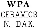Some WPA ceramics items are identified by a rubber ink stamp, WPA Ceramics N. Dak. Others were hand etched or incised. Pieces marked WPA and not identified by state, or not marked at all can not be attributed to the North Dakota project as several other states also had WPA Ceramics projects.