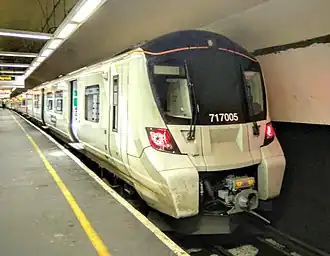 Services are currently operated by dual-voltage Class 717 electric multiple units (EMUs), which replaced Class 313 units as part of a franchise commitment when Govia Thameslink Railway took over management of the line and its services.[19] The Class 717s began to enter service in March 2019.[20] To comply with regulations for trains operating in single-bore tunnels where there is not enough clearance space for side evacuation, they have emergency doors at both ends of a unit. When operating on 750 V DC, the two motor coaches of a Class 313 collected traction current from their own shoe gear only; there was no traction bus linking them together as found on most electric multiple units. All of the Class 313 units when operating on the NCL had their Driving Motor B vehicle at the London end, and whilst on 750 V DC were electronically limited to 30 mph (48 km/h),[21] which is the maximum line speed.[4] All stations are long enough to accept six-car trains.[22]