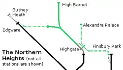 After the war there were proposals to extend the Northern City Line north and south. The London Plan Working Party Report of 1949 proposed several new lines and suburban electrification schemes for London, lettered from A to M. The lower-priority routes J and K would have seen the Northern City Line extended to Woolwich (Route J) and Crystal Palace (Route K), retaining the "Northern Heights" extensions to Edgware and Alexandra Palace. The lines would have run in small-diameter tube tunnels south from Moorgate to Bank and London Bridge.[10] The "K" branch would have run under Peckham to Peckham Rye, joining the old Crystal Palace (High Level) branch (which was still open in 1949) near Lordship Lane. Nothing came of these proposals, and the Edgware, Alexandra Palace and Crystal Palace (High Level) branches were all closed to passengers in 1954. As a result, the Northern City Line remained isolated from the rest of the network.