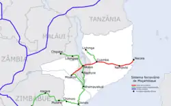 Nacala railway, also known as Northern Corridor railway and Nacala Corridor railway, is a railway line that operates in northern Mozambique on a 912 kilometres (567 mi) line[1] that runs west from the port city of Nacala, crossing the central region of Malawi, connecting with the coal belt of Moatize, in northwest Mozambique. It is connected to the Dona Ana-Moatize railway branch and the Sena railway (Chipata-Lilongwe-Blantyre-Nhamayabue-Dondo). It also has a 262 kilometres (163 mi) branch line from Cuamba to Lichinga.[2]