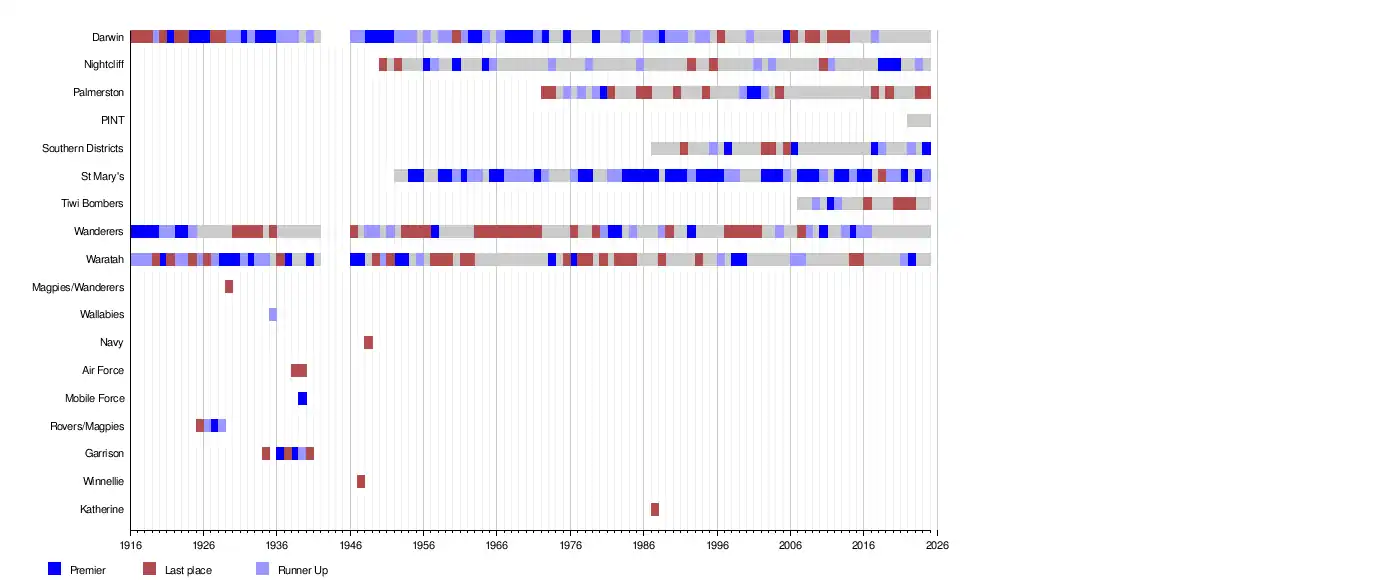 | Darwin | 23 | 30 | 1921/22, 1924/25, 1925/26, 1926/27, 1931/32, 1933/34, 1934/35, 1935/36, 1948/49, 1949/50, 1950/51, 1951/52, 1962/63, 1963/64, 1967/68, 1968/69, 1969/70, 1970/71, 1972/73, 1975/76, 1979/80, 1988/89, 2005/06 |