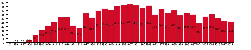 | 1930 | 374,854 | 31.4 | 47 / 150