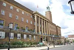 City Hall has an art deco interior, a top-floor cupola, mahogany panelling, and one of the longest balconies in England.[2][3]