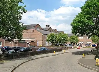 The first new structure was the new magistrates' court building, on the southwest part of the site, which was designed by the city architect, Robert Goodyear, in the debased neoclassical style, built in red brick and was completed in 1985. This was followed by the crown and county courts, on the northeast part of the site, which was designed by the Property Services Agency in the same style, built in red brick at a cost of £7 million,[7] and was completed in 1988.[8][9] The design of the crown and county courts building involved two sides of a courtyard which faced southwest. The northeast side of the courtyard featured three recessed doorways on the ground floor, a Royal coat of arms above the central doorway and three pairs of small square windows on the first floor. The northwest side of the courtyard was formed by a two-storey lean-to which was fenestrated with large casement windows on the ground floor and pairs of small square windows on the first floor. There was also a second floor, which was set back, fenestrated by Diocletian windows and surmounted by gables. Internally, the building was laid out to accommodate seven courtrooms.[10]