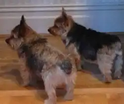 These terriers are one of the smallest working terriers weighing approximately 12 pounds (5.4 kg) and ideally not being above 10 inches (25 cm) at the withers, with prick ears and a double coat, which comes in all shades of red, tan, wheaten, black and tan, and grizzle.[2] The skull is broad and slightly rounded with a well defined stop. The muzzle ratio to the head is 2:3. The eyes are small and oval-shaped. Ears are usually erect — but can be laid back when the dog is calm — and set apart with good width between them. The tips are pointed. The back is short with good depth and a well sprung loin. Legs are short with the elbows being more proximal than distal. Tail is of moderate length when not docked, thick at the base with tapering near the top. Tail should be 'carried jauntily' and 'not excessively gay'.[3] The American Kennel Club standard calls for a 'medium docked' tail with enough of the tail being left on so that it can be held or grabbed.[2]
