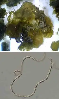 Nostoc verrucosum is a species of cyanobacteria usually found in colonies and in globose racks. It has a greenish to blackish color. It grows in creek beds, shallow streams, waterfalls, and moist understory in rain forests, in alkaline soil and water habitat. Colonies are velvety to the touch.