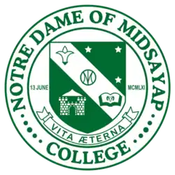 Notre Dame of Midsayap College (Filipino: Dalubhasaang Notre Dame ng Midsayap or Kolehiyong Notre Dame ng Midsayap), colloquially known as NDMC or simply Notre Dame, is a private, Catholic basic and higher education institution run by the Missionary Oblates of Mary Immaculate in Midsayap, Cotabato, Philippines. Established by the Oblates on 13 June 1941 making it as the First Notre Dame School in Asia and in the Philippines, it was the first in the long list of schools named Notre Dame in the Philippines that form the Notre Dame Educational Association under the patronage of the Blessed Virgin Mary, the school Patroness and St. Eugene De Mazenod as the school's patron saint.