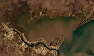Nueces Bay covers an area of 28.9 square miles (75 km2) and drains the 16,950 square miles (43,900 km2) of the Nueces River basin.[14] It has an average depth of 2.3 ft, and a volume of 39,700 acre-feet (49,000,000 m3).[15] The bay is considered the southern extreme of the Texas Coastal Plain, which stretches northeast to Galveston Bay,[16] and is part of the geographic transition from the grasslands of the coastal plain to the dry brush region of South Texas.[14] It forms at the base of the Nueces River, which enters at the southwesternmost point of the bay. North of the Nueces entrance is the extension of Odem Bay, named for the nearby settlement of Odem. This extension includes shallow marsh fed by an extensive system of tidal streams including Rincon Bayou, and is headed by Whites Point to the east.[17] Due south of Whites Point at the mouth of Odem Bay, is an oil field, situated against the backdrop of heavy industry on the shore to the southwest. The southern shore, which continues toward Rincon Point, is slender due to the industrial canal dredged to the south to the Port of Corpus Christi. The mouth of Nueces Bay on Corpus Christi Bay from Rincon Point to Indian Point, is crossed by the mile-long (1.6 km) Nueces Bay Causeway, which leads to Portland. West Portland is found on the shoreline of the bay as it curves north and west, which is lined with piers and residences. The bay leads back west to Whites Point on the north shore, which is largely used for agriculture.[18]