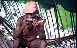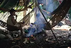 Nukak take the sweet resin from "mupabuat" (Lacunal sp.) and the rattan water (Doliocarpus sp.). They cover their encampments ("wopyi") with leaves of Phenakospermum guyannense and palms, and make their hammocks with fiber of the cumare palm Astrocaryum sp.; moorings with Heteropsis tenuispadix, Eschweilera sp., and Anthurium sp.; blowguns with Iriartella stigera, Bactris maraja; bows with Duguetia quitarensis; axe ends with Aspidosperma sp.; darts with thorns of Oneocarpus sp.; dart quivers with leaves of Calathea sp.; milkweed with Pachira nukakika, Ceiba sp., and Pseudobombax sp.; loinclothes for men with Couratari guianensis; baskets with Heteropsis spp.; disposable bags with Ischnosiphon arouma and Heliconia sp.; soap with Cedrelinga sp.; perfumes with Myroxylon sp. and Justice pectoralis; and diverse objects.[3][8][9] They make blades with the teeth of piranha but have also adapted to use metals. Until 1990, they practised small-scale pottery, producing a small kind of pot to take with them on their travels and a second, bigger kind, to leave as supplies in their camping sites. Today, they prefer to obtain metallic pots. When they do not have matches or lighters, they use special wood (Pausandra trianae) to produce fire. They no longer make mirrors with the resin of Trattinickia glaziovii nor stone axes.[3][7][8]