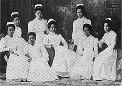 In 1887, the Japanese Red Cross (JRC) was founded[3] and by 1890 had begun teaching and recruiting nurses for training.[4] Though their nurses were still studying when the Sino Japanese War broke out, the JRC decided to send trainees to help with relief efforts. From 1894,[5] JRC Nurses served in numerous conflicts helping with the wounded, including in the Boxer Rebellion (1900), the Russo-Japanese War (1904),[6] World War I and the Japanese intervention in Siberia (1919).[7] The JRC Nurses' training program required three years of study with the first year dedicated to theory, including courses on anatomy, bandaging, disinfection, hygiene, instruments, women's health, obstetrics, as well as basic assistance of surgery and health treatment and the latter two years involved in practical training.[8] Completion of the course required a final examination before diplomas were given and additional six months of training could qualify nurse candidates as head nurses.[4] Because the JRC was under government control, their hospitals spread to all the major cities and a uniformity of training made the organization a leader in nursing development.[9]