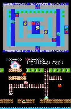 Nuts & Milk (ナッツ&ミルク, Nattsu to Miruku) is a puzzle-platform game developed and published by Japanese software developer Hudson Soft in 1983. The game was first released on Japanese home computers such as the MSX,[3] NEC PC-6001mkII,[3] Sharp X1,[3] Fujitsu FM-7,[3] Hitachi S1[4] and later to the Family Computer in Japan. Along with Lode Runner, it was the first third-party video game to be released on a Nintendo console.[5]