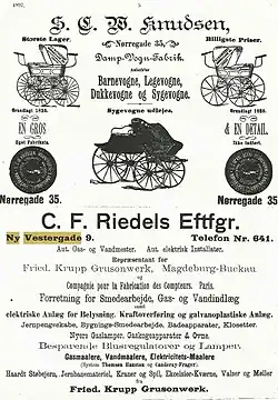 At the 1895 census, Riedel's widow had moved to Ordrup but was still the owner of the property in Ny Vestergade. Both Riedel's former company and the Ny Vestergade complex were the following year taken over by Johan C. B. Howitz (1855-1908). In 1901, all the residents (seven apartments) were associated the firm which was now operated under the name C. F. Riedels Eftf. ("C. F. Riedel's Successor"). Howitz's widow Ella Kirstine continued the company after her husband's death in 1908. In 1910, she married stage director Paul Søren Nielsen (1862-1931) in Hellerup. Ny Vestergade 9 was in 1918 sold to Jacob Stilling-Andersen, founder of the Danish Butter Export Union.[9]