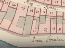 No. 29 was later divided into two properties, one in Nybrogade and one in Snaregade. The property in Nybrogade was listed in the new cadastre of 1756 as No. 20 and belonged to skipper Niels Christensen Spering at that time. The building in Snaregade was listed as No. 23 and belonged to Salomon Solomonsen. The old No. 30 was listed as No. 24 and was also owned by Salomon Solomonsen,[2]