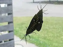 The adult moth has black wings with white markings on both the forewings and hindwings. The forewings have two white spots that are more elongated while the hindwing only has a single spot near to the centre;[2][4] the wingspan is 35–45 mm.[2][5][6] The thorax and abdomen of the moth are black with bands of orange.[1] The magpie moth is diurnal which, coupled with its colourful markings means it is often mistaken for a butterfly.[2][4][7] It is most active from September to June in the mornings and evenings where it can be seen flying over the tops of host plants.[1][4][5]