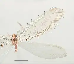 A nygma (plural nygmata) is a spot on the wings of certain insects which have a peculiar dense cuticular structure. They are found only in the wings of endopterygotes but found only in some insect groups. Nygmata are found in caddisflies, scorpionflies, saw-flies and in some families of Neuroptera (e.g. Megaloptera and Ithonidae). The function of nygmata are unknown: they do not connect with nerves or glands. They are typically circular. They never occur on the veins and veins always appear to branch around them. Nygmata show up even in fossil Osmylidae from China. The positions and structure of nygmata are often used in the descriptions of insect species that bear them.[1][2]