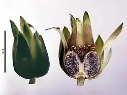 Cross pollination of the protogynous flowers occurs frequently.[11] However, since the stigma remains receptive in the second day, which is when the pollen is released, autogamy is possible as well.[9] The seeds are very numerous. In one case, 4365 seeds were found in a single fruit.[3] A range of 1000 to 8000 seeds has also been reported.[4]