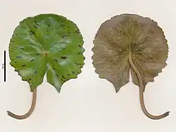 The ovoid to subglobose rhizome may exceed 7 cm in length and 8 cm in width. It is not stoloniferous.[2] Its leaves are thick and leathery, round to kidney-shaped or broadly heart-shaped. The leaf blade is 17-18 cm long and 19-21 cm wide. In deeper water, they can grow up to 35 cm. The margin is dentate and has uneven, blunt teeth, although towards the apex the margin is almost entirely smooth.[3] It is the sole member of its subgenus featuring leaves with dentate margins. However, it also produces submerged leaves with entire margins, if it grows in flowing water.[2] The adaxial leaf surface is shiny and light green with some red colouration in the centre and towards the edge. Younger leaves exhibit brownish red spotting. The abaxial leaf surface, which features protruding leaf venation, displays a brownish-purple colouration with irregular spotting. The petiole is reddish-brown,[3] up to 9 or 11 mm wide, glabrous and has 2 primary, as well as 4 to numerous secondary air canals.[2] From each leaf base, 6-7 roots emerge.[4]