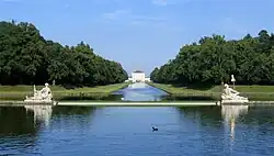 The canals of Nymphenburg are part of the northern Munich channel system, a system of waterways that connected also to the complex of Schleissheim Palace. The endpoint of the eastern canal leading from the city to the palace forms the Cour d'honneur and the centre was designed by Effner as a water parterre with a fountain, cascade and branching canals on both sides. The driveway ("Auffahrtsallee") from the city on both sides of the eastern canal is framed by a semicircle of smaller baroque buildings ("Kavalierhäuser") at the Cour d'honneur. The eastern endpoint of the canal is the Hubertusbrunnen (1903, a fountain building by Adolf von Hildebrand).[9]