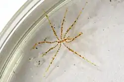 White, translucent or reddish, occasionally with violet bands. Slender body (2.5-3.0 mm) and legs that are three and a half times as long. The proboscis is relatively short. The abdomen is thick, and the thoracic segments are broader than long. The palps have five joints. The propodus is longer than the tarsus, which is covered with numerous short spines and three longer ones near the heel.[2]