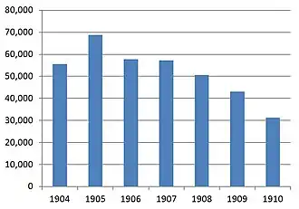 O'Brien's company soon encountered problems. Despite expectations, Dawson City's population began to decline again: one resident, Laura Berton, later described how people were "trickling from it like water from a leaky barrel".[22] By 1909 the population had fallen to 2,000, driving down demand for the brewery's products.[22] Export sales in the highly competitive Alaskan marketplace failed to materialise.[23] The temperance movement also gained ground, almost managing to pass a law introducing prohibition across the territory in 1916. The number of licensed saloons dropped sharply, from 21 in 1902 to only 6 in 1906, and other sales outlets were curtailed.[24] Despite the company's efforts to advertise their product - promoting the health benefits of beer and the company's role in championing a local, pioneering industry - sales dropped considerably after 1908, falling to 31,305 gallons by 1910.[25]