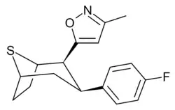 - ^ Purushotham M, Sheri A, Pham-Huu DP, Madras BK, Janowsky A, Meltzer PC (January 2011). "The synthesis and biological evaluation of 2-(3-methyl or 3-phenylisoxazol-5-yl)-3-aryl-8-thiabicyclo[3.2.1]octanes". Bioorganic & Medicinal Chemistry Letters. 21 (1): 48–51. doi:10.1016/j.bmcl.2010.11.076. PMC 3015105. PMID 21146984.
