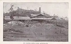 At first the OK Copper Mines Development Syndicate NL employed a dozen men mining the rich surface ore (37% copper) which was hauled to Mount Garnet for smelting. A road was completed to Mungana on 9 August 1902, and the first three teams departed that day with 211 long tons (214 t) of copper ore for Mungana railway station for transportation to the Mount Garnet smelters at a freight cost of £3/10/0 per ton.[1]