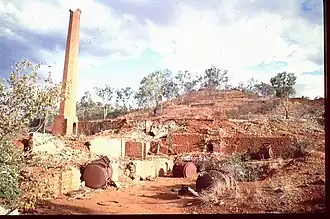The smelter site comprises four terraces with stone retaining walls, of which there are two main levels. The lowest level, or copper floor, contains a number of items of plant including four copper converter vessels and two converter hoods, a portable steam engine and an Aveling and Porter, Rochester steam traction engine. Below the upper level, or furnace floor, there is evidence of a long brick flue leading to the tall brick chimney which is octagonal in section. The chimney stands intact with some vertical shearing of brickwork around the top, probably as a result of lightning strikes. The power house site immediately east of the chimney contains concrete engine mounts, brick boiler foundations and the brick base of a metal chimney.[1]