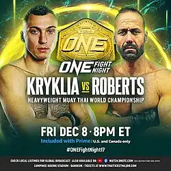 ONE Fight Night 17: Kryklia vs. Roberts was a Muay Thai event produced by ONE Championship that took place on December 9, 2023, at Lumpinee Boxing Stadium in Bangkok, Thailand.[1] It marked the first event that was only a Muay Thai card.[2]