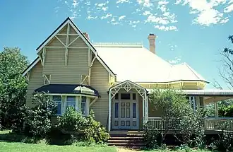 The dwelling is asymmetrical in form, with a steeply pitched roof, from which wide gables project on the main elevation and on the eastern side of the building. A corner bay window is carried through into the main roof and is expressed as a chamfered hip. Two tall brick chimneys protrude through the corrugated iron roof and the main section of the roof is capped with cast-iron ridge decoration. A short set of unbalustraded stairs leads to a wide verandah that wraps around to the northern elevation. The verandah is edged with a three-rail dowel balustrade and has a bullnose roof stepped-down from the main roof. The verandah porch is decorated with angular timber members in a pattern of triangles. This stick-style detailing is repeated on the main gable, which is decorated with an angular pattern of timbers which are held by brackets from the gable and barge boards. Under the gable is a bay window with a curved awning which is supported on large decorative timber brackets.[1]