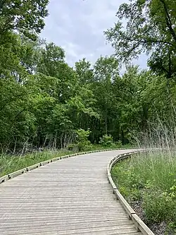 In the southeastern region of the park, there is an equestrian area where visitors can ride horses. There are 26 trails. The North Trail connects to the Six Cities Trail in Allen, which connects to the Bluebonnet Trail.[1] Timber Chase Trail is a 0.88-mile trail which borders the main lake in the center of the park.[2][3] Wildlife includes bobcats, coyotes, snakes, rabbits, turtles, and fish. Visitors can take the paved multi-use trail to the neighboring Bob Woodruff Park to see the oldest tree in Plano, a 200-year-old Bur Oak.[4] The lake is open to kayaking, canoeing, and stand-up paddle boarding from sunrise to sunset.[5]