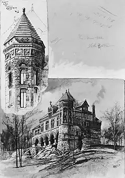 The structure's main facade, altogether 96 feet (29 m) long by 51 feet (16 m) deep, presents an arcade of five massive arches with a row of windows set above and an octagonal tower at its right corner. Its first floor is constructed of native, pinkish-gray North Easton granite with Longmeadown brownstone trim. The second floor is brick, with a north-facing dormer half finished in timber and stucco. The steeply peaked roof above is finished in red tile. The front's third-floor, dormer window is wreathed with sculpted foliage, and displays the initials O. A. and twelve signs of the zodiac.