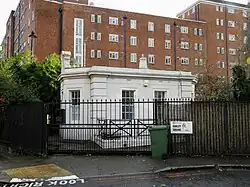 It was originally part of the Bedford Estate belonging to the Dukes of Bedford, and takes its name from the village of Oakley in Bedfordshire which belonged to the family from the eighteenth century.[1] It was laid out in the early Victorian era, later than nearby Mornington Crescent and Arlington Road and around the same time as Harrington Square. On the northern side some of the Victorian terraced housing still exists as well as the redbrick Working Men's College established in 1854.[2] On the southern side the original buildings have been replaced by more recent developments. The Godwin Court Council apartment block was built on the east end of the square on a large bomb site, there was also a EWS (Emergency Water Supply) tank on the bomb site, Godwin Court was built after 1946. The white stucco Victorian lodge in the gardens is now Grade II listed[3] as are a number of the houses.[4][5]