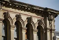 Weathered cornice and decorated keystones in the harbour area of Oamaru.