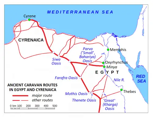The Siwa Oasis was a famous oracle site of the Egyptian god Amun. In the 7th or 6th century BCE the cult of this Amun became established in the Greek colony of Cyrene, where Amun was equated with the Greek god Zeus ("Zeus Ammon").[5] Samians were prominently present in ancient Cyrene,[6] so they might be the missing link who brought the cult of Amun to Cyrene—a major caravan route led from Minya on the Nile via Siwa to the West, where it reached the sea at Cyrene. This route came in use ca. 650 BC, that is, at the same time as or slightly before the foundation of Cyrene in 632/1 BCE.[7]