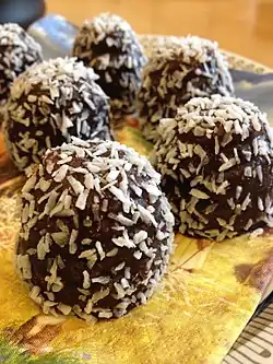 [the spherical pastry which is normally rolled in shredded coconut or pearl sugar, which many call chocolate ball or shredded-coconut-ball today.] - ^ Palsbo, Susanne (1943). Opfindsomhed i en Krisetid : en Haandfuld Rationeringsopskrifter og aktuelle Husholdningsraad (in Danish). Copenhagen: Nationaltidende. p. 62.