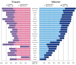 A 2007 study shows Germany had the highest number of overweight people in Europe.[5][6] However, the United Kingdom, Greece and certain countries in Eastern Europe have a higher rate of "truly obese" people.[7] In 2007, The German obesity rate was considered at the same level as with the American obesity rate.[8] In Germany, 60% of men and 43% of women are considered overweight while in France, 38.5% of men and 26% of women are considered overweight.[9] Germans are considered thinner than people in the United Kingdom.[9] The waist of female Germans between the ages of 14 and 70 grew by 4.1 centimetres between 1994 and 2009.[10] The belly girth of men between 16 and 70 grew by 4.4 centimetres between 1980 and 2009.[10]