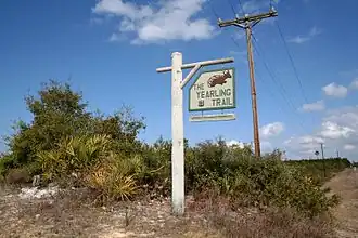 Marjorie Kinnan Rawlings lived much of her adult life just a few miles north of the Big Scrub in Cross Creek, Florida. She reported that the only inhabitants of the area lived in hammocks along streams or next to lakes, but not in the scrub itself. Rawlings based some of her writings (including South Moon Under and The Yearling) on the lives of the settlers around the Big Scrub after staying with families there.[6] She described the Big Scrub in detail, stating that it was unique in the world. She wrote, "There is no human habitation—there never has been and probably never will be—in the scrub itself." She called the scrub "a vast wall, keeping out the timid and the alien."[7] Patrick D. Smith, in writing about Rawlings, stated about the Big Scrub, "In all of America there is not a more wild and hostile land."[8]