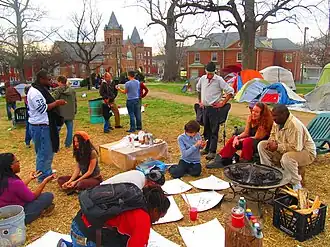 Occupy Charlottesville was a social movement in Charlottesville, Virginia, United States, that began on October 15, 2011,[1] in solidarity with Occupy Wall Street and the rest of the Occupy movement. The downtown Lee Park encampment was taken down on November 30, 2011, when 18 members of the movement were arrested and charged with trespassing.[2] The group failed to establish a campsite after the eviction, although they continued to hold their 'General Assemblies' and participate in targeted actions for several months thereafter.[3] The group's protests target social and economic injustice both locally and nationally.