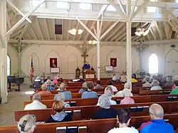 In the days before electronic amplification, this allowed a preacher to be heard throughout the vast space. The building features a lighting system advanced for its time: arching rows of bulbs hanging from the varnished wood ceiling paneling. Also novel is a painted representation of a waving American flag (c. 1916 and rebuilt) covered with light bulbs that flash in an undulating manner. Illuminated signs, possibly the very oldest surviving examples of that type (1894), proclaim "Holiness to the Lord" and "So be ye holy", a reflection of the emphasis at camp meetings. The illuminated Memorial Cross was placed on the Auditorium's front façade at the end of World War II in 1946.[33]