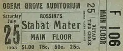 As Ocean Grove drew more and more visitors, the facilities were outgrown, and construction of the present Great Auditorium was completed in 1894. Originally designed to accommodate crowds of as many as 10,000 people, the subsequent installation of theater-style cushioned seating in many sections reduced seating capacity to 6,250.[21] It remains Ocean Grove's most prominent structure and the centerpiece of its summer programs (see more about the Auditorium further down the page). By the early 20th century, said The New York Times in 1986, it was called the "Queen of Religious Resorts ... Visitors would travel miles to bask in the Victorian seaside splendor and to attend engaging, extroverted religious ceremonies. Millions of people, tourists and pilgrims both, made the trip to Ocean Grove every summer."[17] The social disillusionment around 1920 following World War I had a profound effect on Ocean Grove and churchgoing in general. There was a decline in these activities and there was little in the way of new construction in the town after this time. One result was that Ocean Grove became a time capsule of late Victorian and early 20th century architecture.