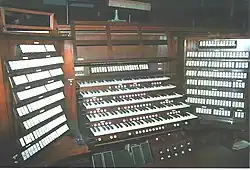 The Auditorium's pipe organ is the 17th largest in the world.[34] Installed in 1908 by the organ builder Robert Hope-Jones, its components have been rebuilt and expanded several times, especially since resident organist Gordon Turk and curator John Shaw (who died on July 24, 2019) took their posts in 1974 and 1975, respectively.[35] Additions made in the 21st century include a 14-rank echo division in 2008, in an effort to broaden the resources necessary to play repertoire of many styles and periods, and to restore those stops unique to the instrument as Hope-Jones conceived it.[36] In the 2010s, the organ continued to be further enlarged and revoiced, with additions underwritten by donors.[37] As of July 2018, the organ has five manuals, 202 ranks, and 12,200 total pipes.[38] About 75 percent of the original Hope-Jones pipework remains extant, according to John Shaw.