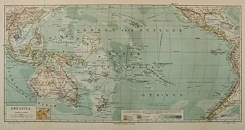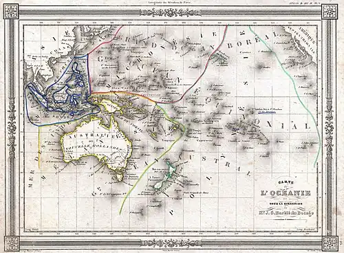 French writer Gustave d'Eichthal remarked in 1844 that, Oceania's boundaries as extending across the entire Pacific Ocean.[79] Conrad Malte-Brun in 1824 defined Oceania as covering Australia, New Zealand, the islands of Polynesia (which then included all the Pacific islands) and the Malay Archipelago.[80][81] Worcester described Oceania as a collection of numerous Pacific islands, categorizing it as one of the world's five major divisions. He also viewed Oceania as covering Australia, New Zealand, the Malay Archipelago and the islands of Melanesia, Micronesia, and Polynesia.[82] In 1887, the Royal Asiatic Society of Great Britain and Ireland referred to Australia as the area's westernmost land,[83] while in 1870, British Reverend Alexander Mackay identified the Bonin Islands as its northernmost point, and Macquarie Island as its southernmost point.[84] The Bonin Islands at that time were a possession of Britain; Macquarie Island, to the south of Tasmania, is a subantarctic island in the Pacific. It was politically associated with Australia and Tasmania by 1870.[85]