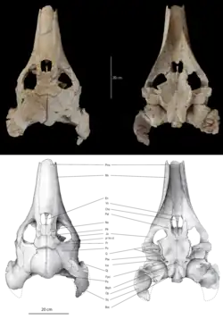 Ocepechelon is known solely from an isolated yet complete skull, 70 centimetres (28 in) in length. From the size of the skull, it must have been one of the largest turtles that ever lived, with estimated carapace length of 130–150 centimetres (4.3–4.9 ft) and total length of 240 centimetres (7.9 ft).[1] The skull of this genus was not only exceptional in size, but also in appearance: large at the back, it narrowed at the front to form a sort of elongated, narrow, bony funnel.[1] The lower jaw and hyoid remain unknown.